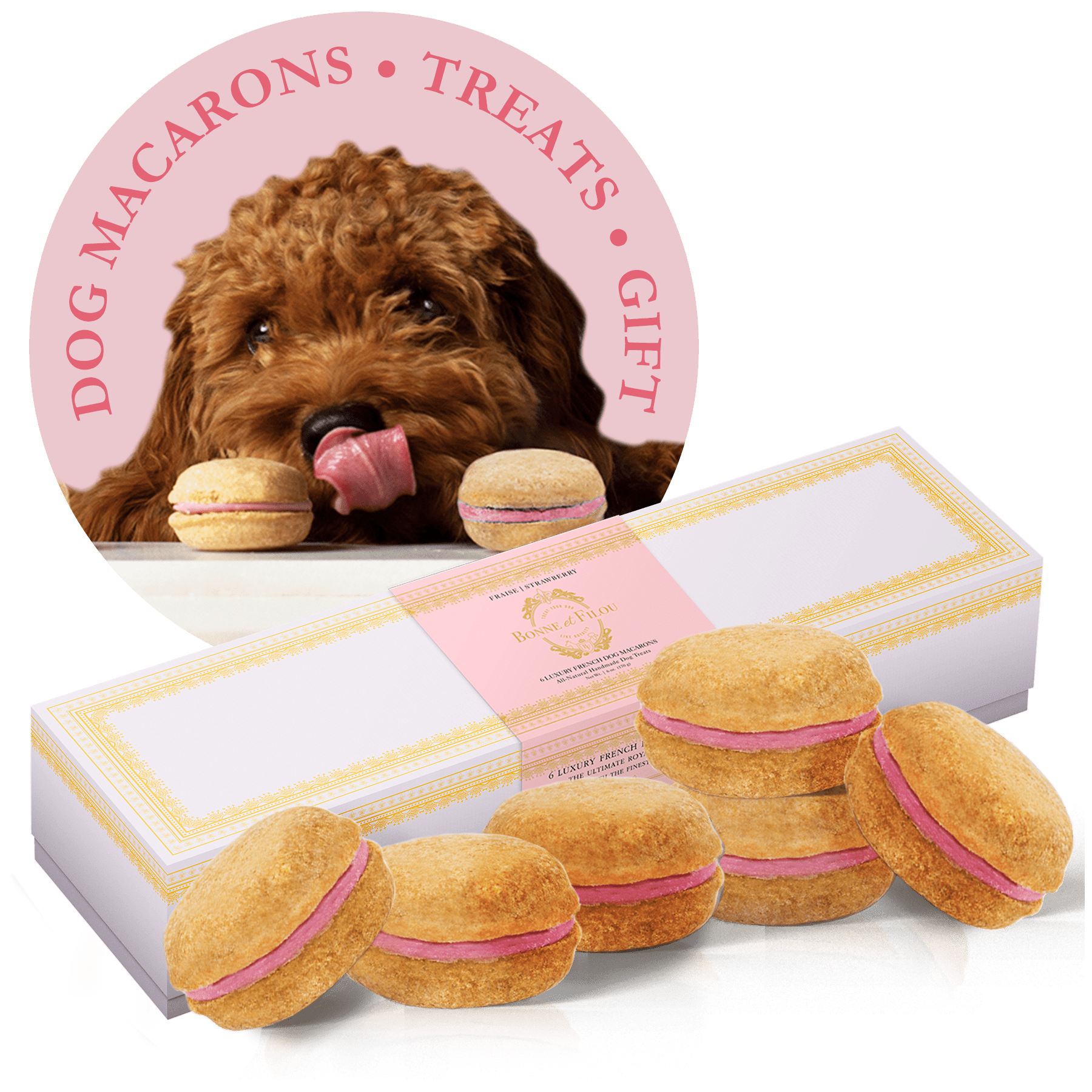 Dog Macarons - Count of 6 (Dog Treats | Dog Gifts)This box of our premium macaron treats features: - Box of 6 dog macarons- Handmade with premium human-grade ingredients in the USA- 100% natural; corn-free; wheat-free ingredients- No artificial coloring or preservatives- Hard treat designed for a long-lasting chew- Shelf life of 12+ months | No need for refrigerationBase Recipe Ingredients: Oat Flour; Honey; Coconut Oil; All-Natural Flavored Yogurt FillingFeeding Instructions:Our treats are hard; designed for a long-lasting chew. For elderly or small dogs; we recommend breaking the treat in smaller pieces (by twisting both sides).