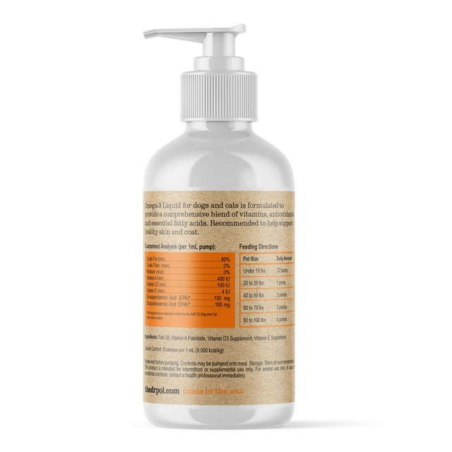 Cat & Dog Fish Oil Pump Bottle: This pet omega 3 supplement uses a handy pump to take the mess out of measured doses! For small or large breed pets, simply pump a dose over food.