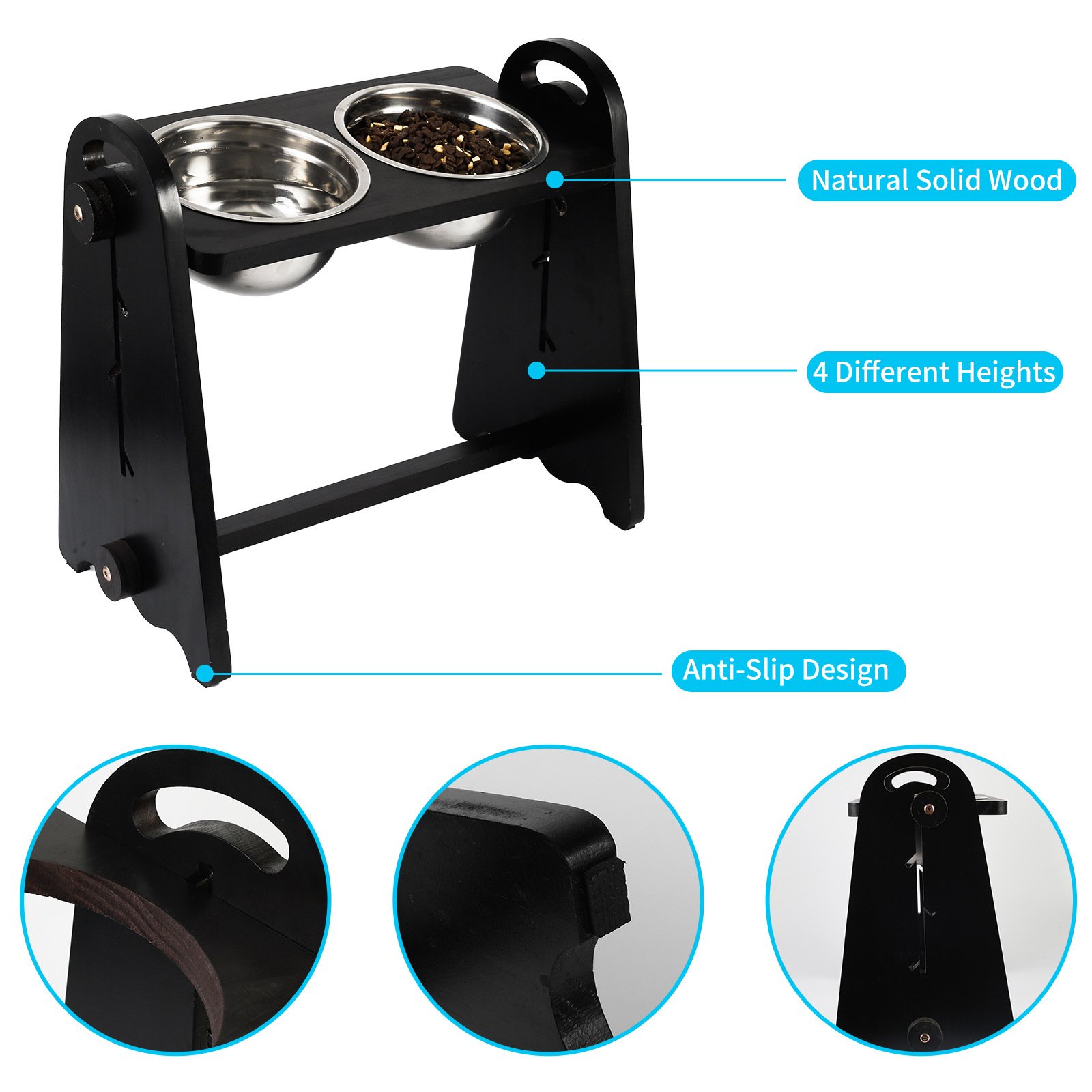 5.Double Stainless Steel Food and Water Bowls Can be Taken out From Stand at any time for Easily Cleaning and Dishwasher Safe, The Solid Wood Surface won’t get Mouldy Even It gets Wet by Food or Water.