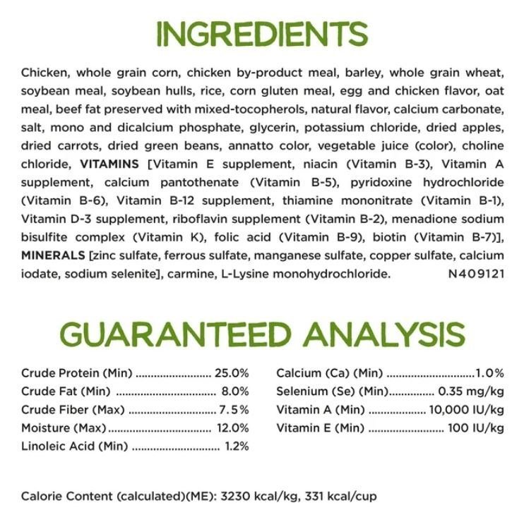 Beneful dog kibble with added vitamins, minerals and nutrients has a naturally delicious taste with no artificial preservatives or flavors and added colors only from natural sources