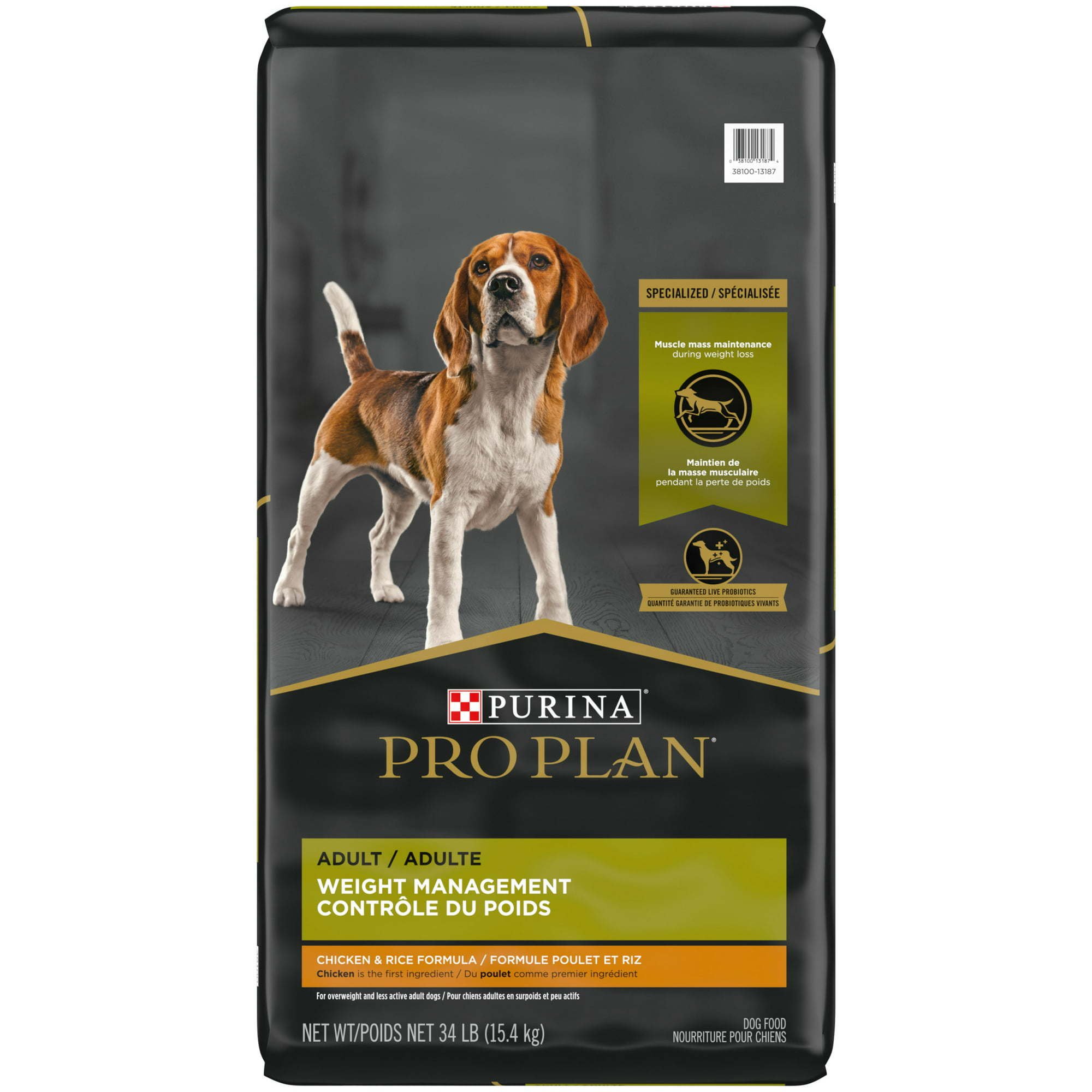 Purina Pro Plan Chicken and Rice for Adult Dogs Chicken Rice, Make sure your dog gets the specialized nutrition his body requires with Purina Pro Plan Dog Food Weight Management Chicken Rice Formula adult dry dog food. Each serving contains 15 percent less fat than Pro Plan ESSENTIALS Shredded Blend Chicken Rice Formula for Adult Dogs, giving you a convenient way to help your dog maintain his healthy weight. Chicken as the first ingredient helps provide protein, one of the essential nutritional building blocks, and a high protein level helps him maintain muscle mass during weight loss.