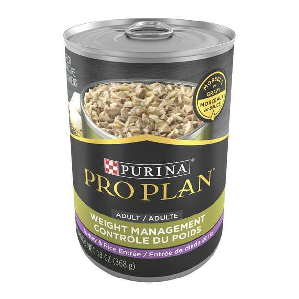 Purina Pro Plan Morsels in Gravy Wet Dog Food for Adult Dogs Turkey, Help your dog maintain a healthy weight with Purina Pro Plan SPECIALIZED Weight Management Turkey and Rice Entree Morsels in Gravy adult wet dog food. Made with real turkey, our high protein dog food helps your pal maintain muscle mass during weight loss. This Purina dog food is an ideal formula for overweight or less active dogs with 25 percent less fat than Pro Plan Complete Essentials Classic Chicken and Rice Entree adult dog food. Plus, the weight maintenance dog food formula helps support a healthy immune system and nourishes his healthy skin and coat.