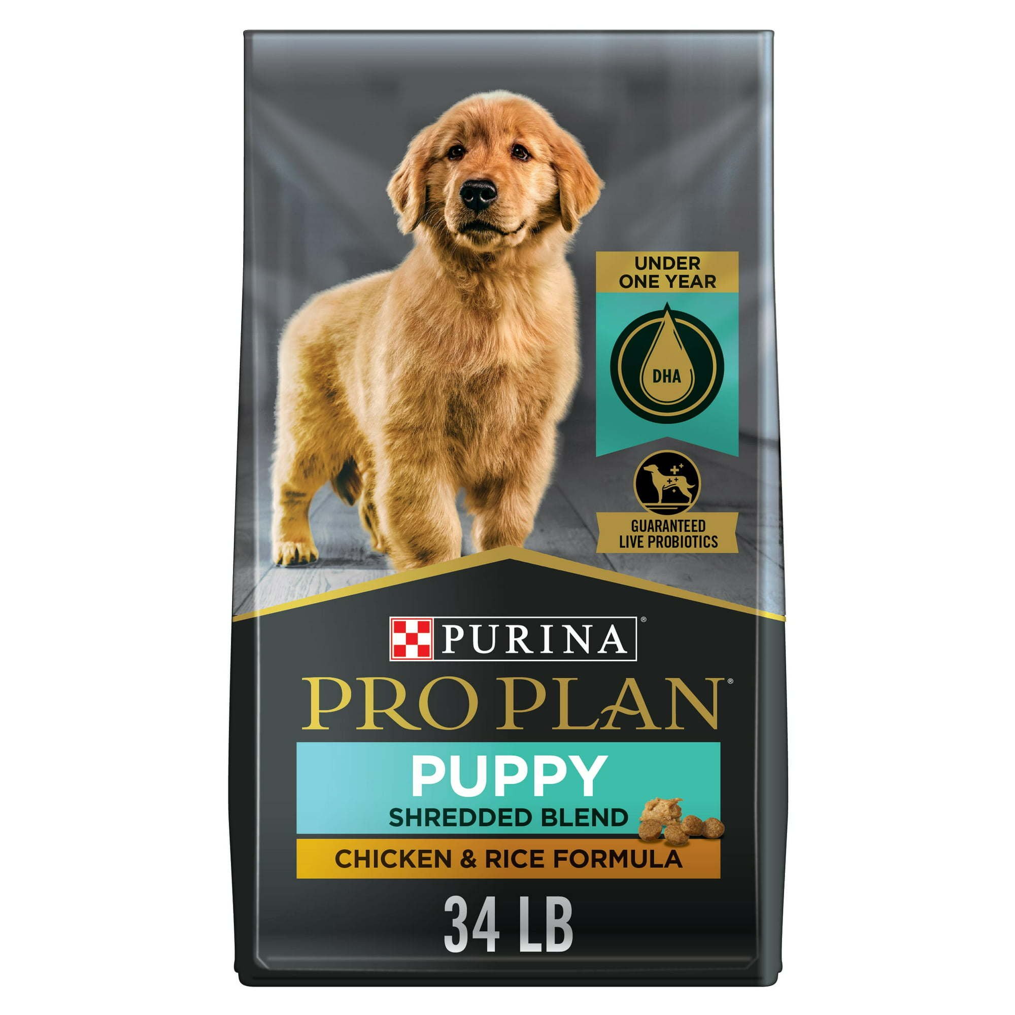 Purina Pro Plan Puppy for Dogs Under 1 Year Chicken Rice, Support your puppy's wellness with the 100 percent complete and balanced nutrition in Purina Pro Plan Brand Dog Food Puppy Shredded Blend Chicken Rice Formula dry puppy food. Real chicken as the first ingredient and rice, a good source of carbohydrates for energy, are part of a formula that provides your puppy with the nutrition he needs. The highly digestible puppy food formula contains no artificial colors or flavors. Plus, the tempting pieces of dog kibble and tender shreds are sized appropriately for his mouth and teeth.